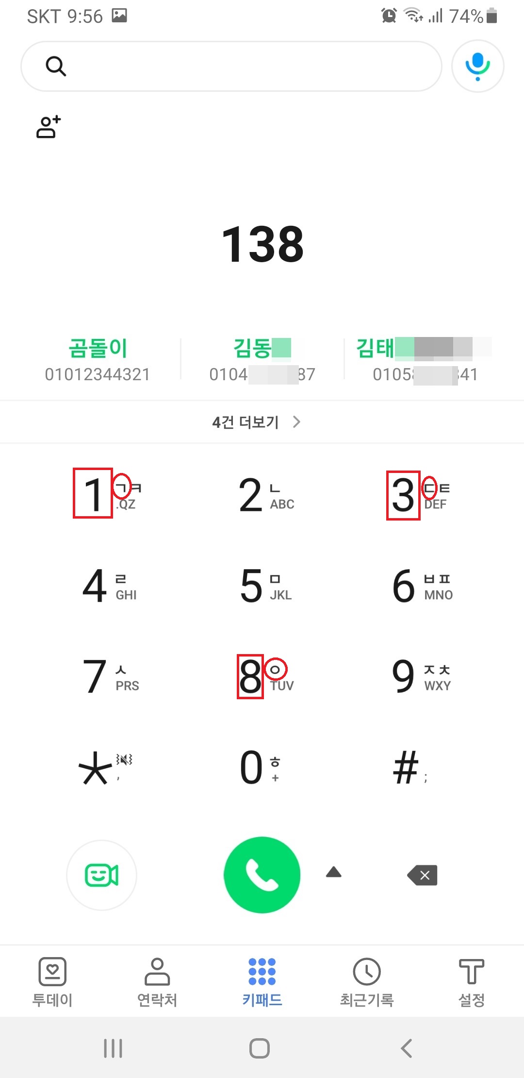 초성이 ㄱ-ㄷ-ㅇ이므로 여기에 해당하는 숫자인 1-3-8 차례대로 누르면 됩니다. 그러면 초성에 해당하는 이름과 번호를 보여줍니다.