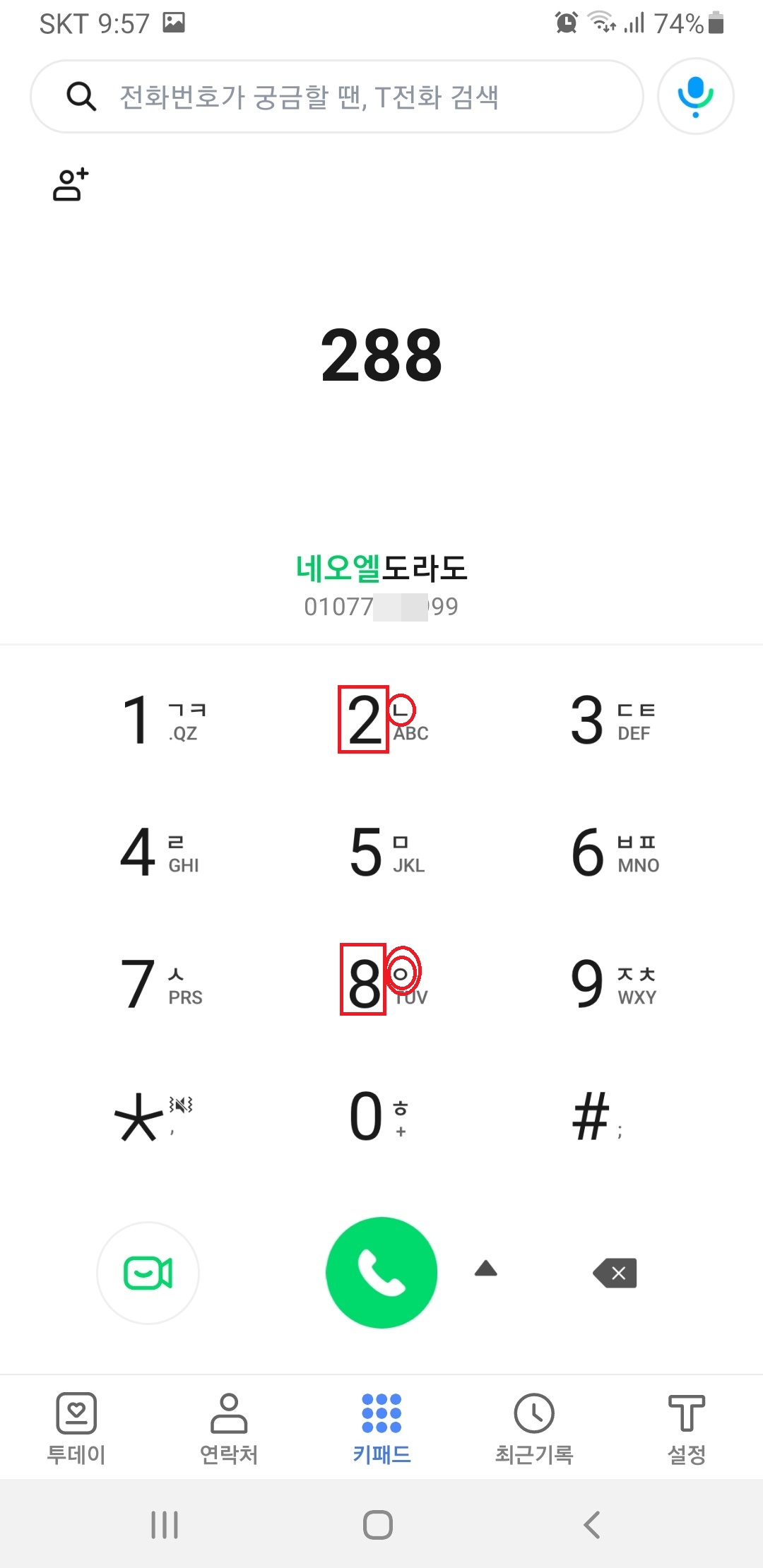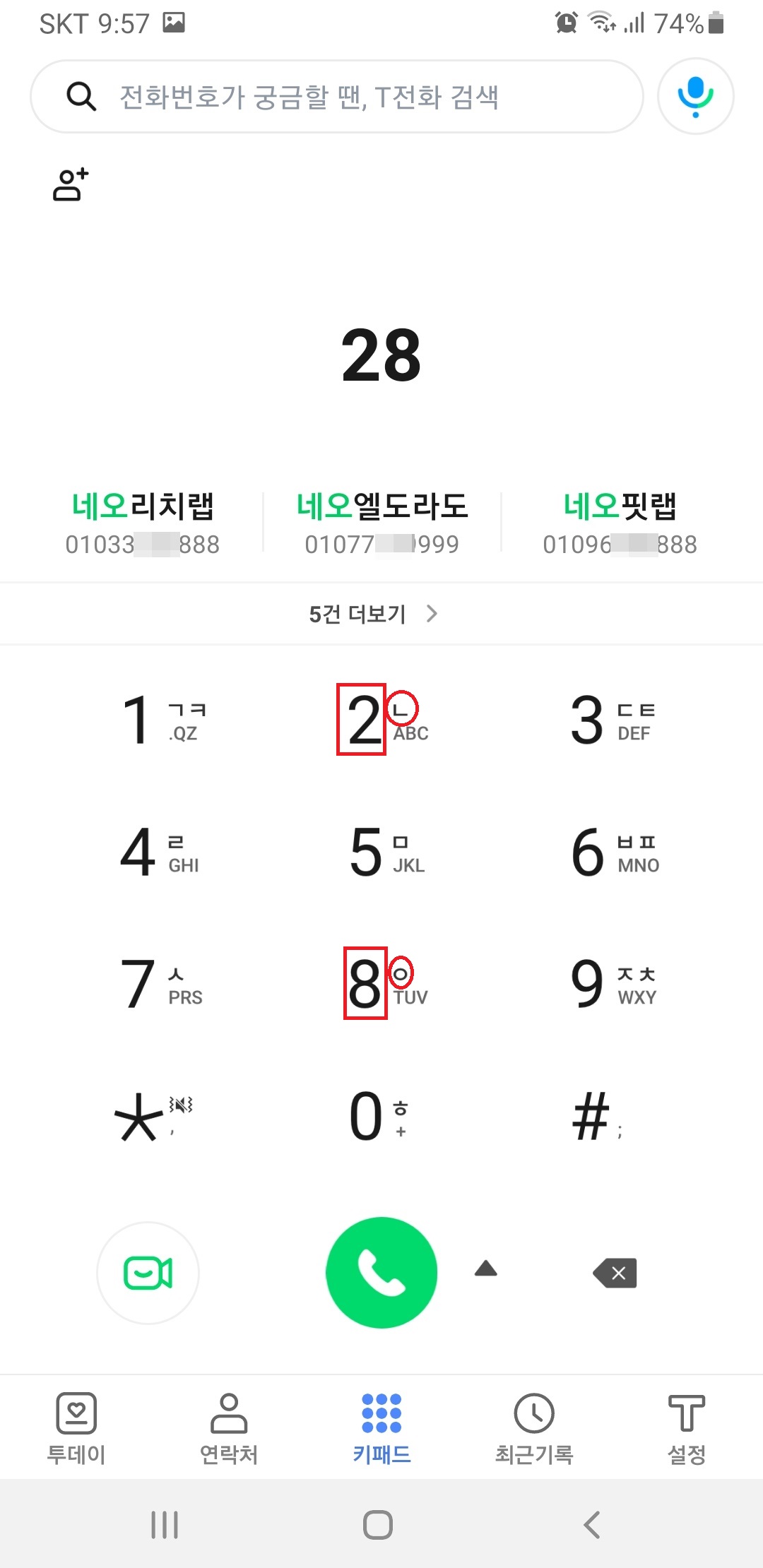 이번에는 다른 번호를 찾아보겠습니다. 네오엘도라도에 전화를 걸기로 하고 초성 ㄴ-ㅇ에 해당하는 숫자 2-8을 차례대로 눌렀습니다. 그러면 다음과 같이 초성에 해당하는 이름과 번호가 표시됩니다.