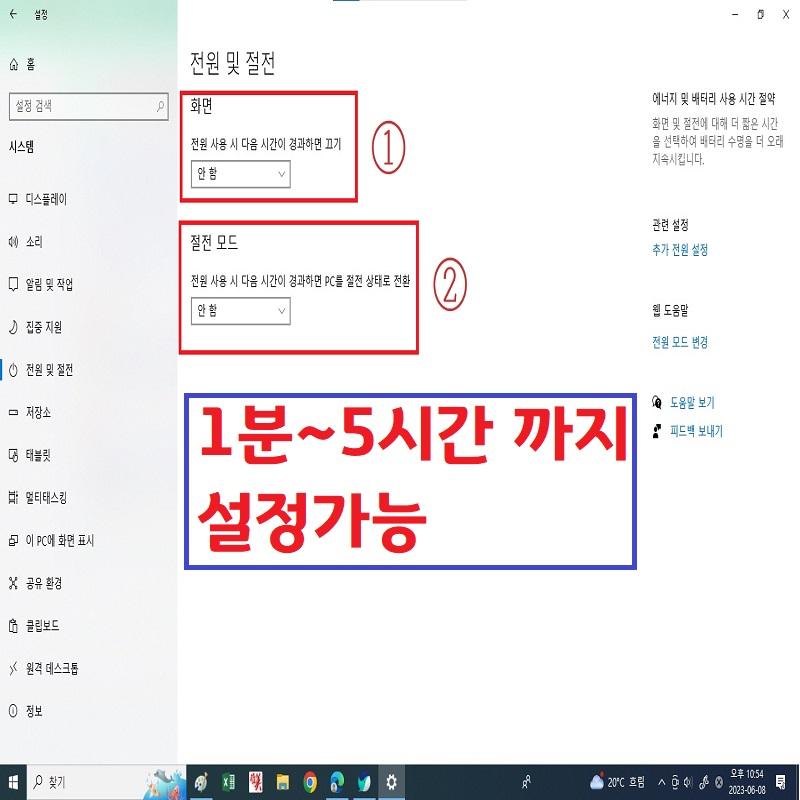 전원 및 절전 설정에서는 크게 두 가지를 설정 할수 있습니다. 한 가지는 '화면 절전'이고 나머지는 '컴퓨터 전체 절전'입니다.