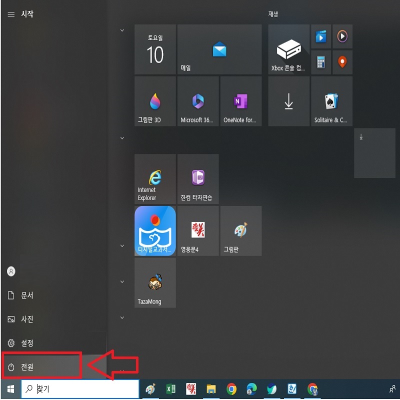 위 그림과 같이 컴퓨터 바탕화면 좌측 하단에 윈도우 아이콘을 클릭합니다. 키보드에서 윈도우 표시 키를 눌러도 동일하게 작동합니다.
