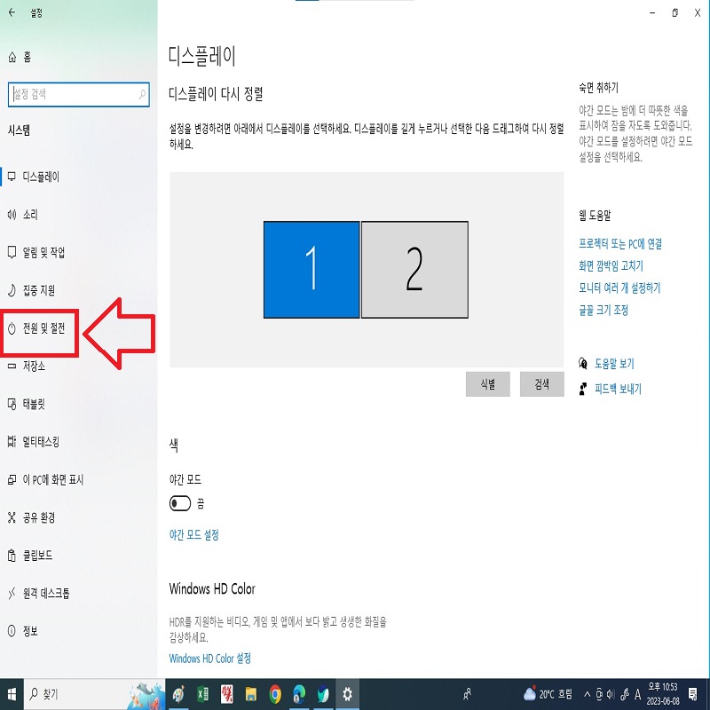 시스템 설정에 들어오면 좌측에 '전원 및 절전'이 있습니다. 여기를 눌러 들어갑니다.
