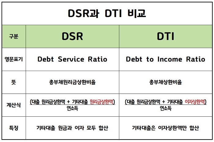 DSR과 DTI를 비교해보면 DSR이 강화된 기준임을 비교로 알 수 있습니다.